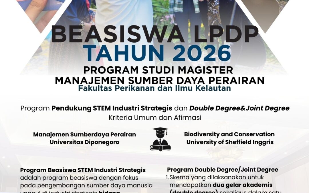 Beasiswa LPDP Tahap 1 Tahun 2026 resmi dibuka! Program Studi Magister dan Doktor Manajemen Sumber Daya Perairan termasuk dalam kategori penerima Beasiswa LPDP. Program Beasiswa STEM Industri Prioritas dibuka guna menguatkan 8 industri strategis yang menjadi lokomotif pembangunan bangsa, ditambah dengan bidang non-STEM with STEM adjective yang berhubungan dan mendukung industri strategis (kebijakan publik dan hukum; bisnis dan ekonomi), serta kewirausahaan dan industri kreatif. Menghadirkan 2 Kriteria Umum dan Afirmasi menjadi kriteria atau latar belakang pendaftar, syarat dan ketentuannya pun menyesuaikan kriteria masing-masing pendaftar.